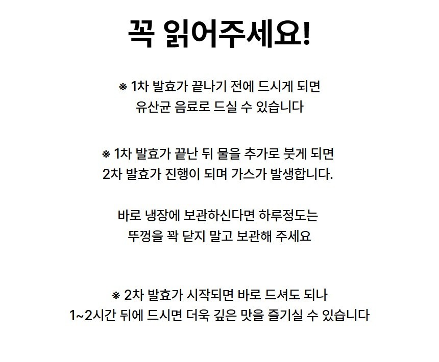 A: 1차 발효 후 물을 부으면 2차 발효가 시작됩니다. 바로 냉장 보관할 경우 가스 배출을 위해 하루 정도는 뚜껑을 살짝 열어두어야 합니다.